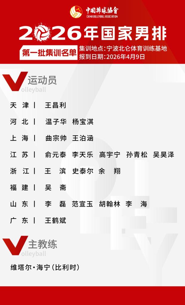 新华社北京4月8日电(记者王镜宇、胡佳丽)中国排球协会8日公布了2026年中国男排第一批集训名单,队伍将于9日在宁波北仑集结。