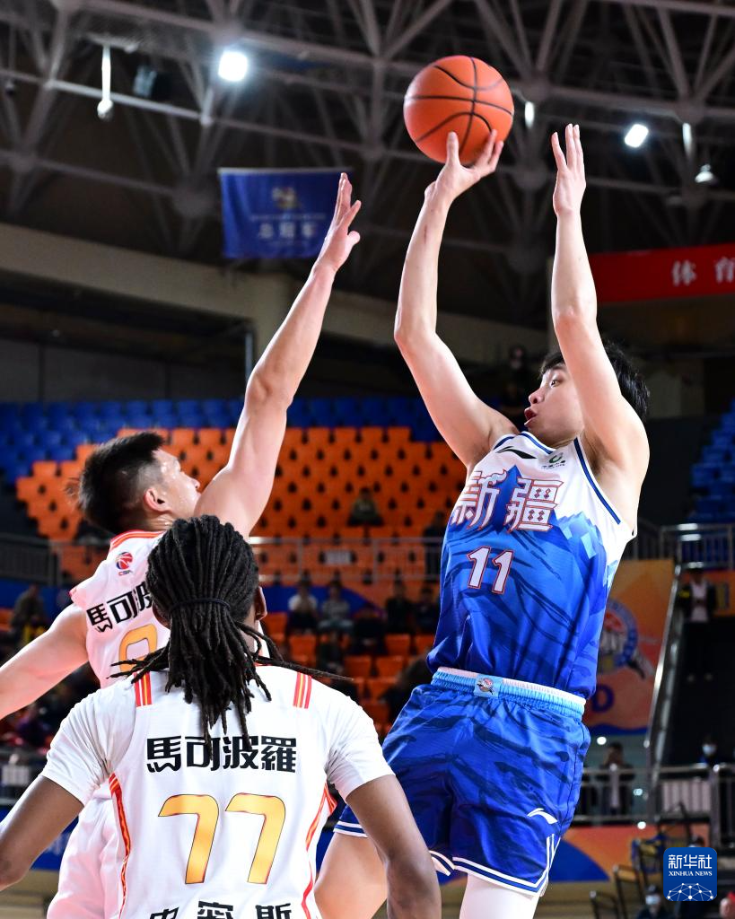 4月15日,新疆伊力特队球员齐麟(右)在比赛中投篮。