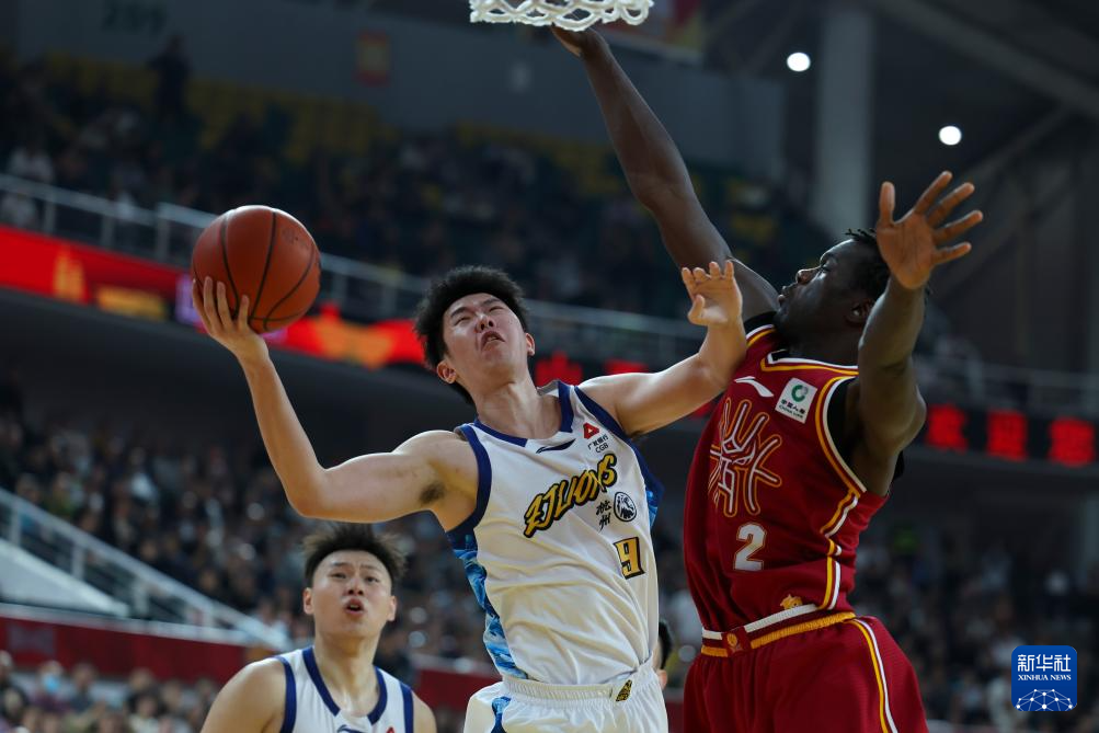4月15日,浙江浙商证券队球员赵嘉仁(中)在比赛中上篮。