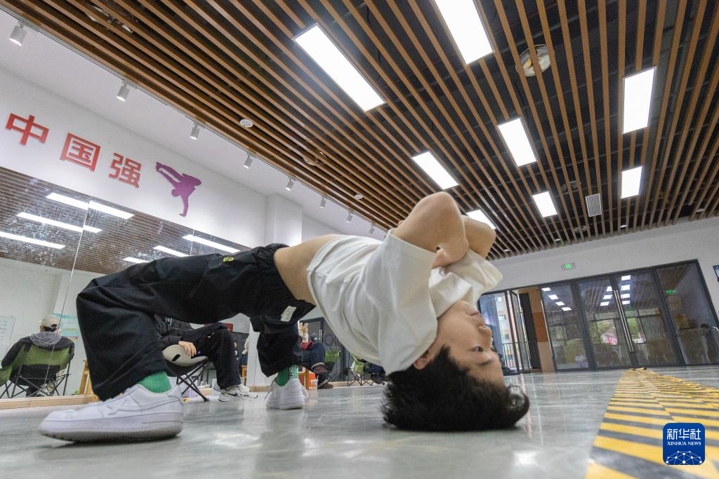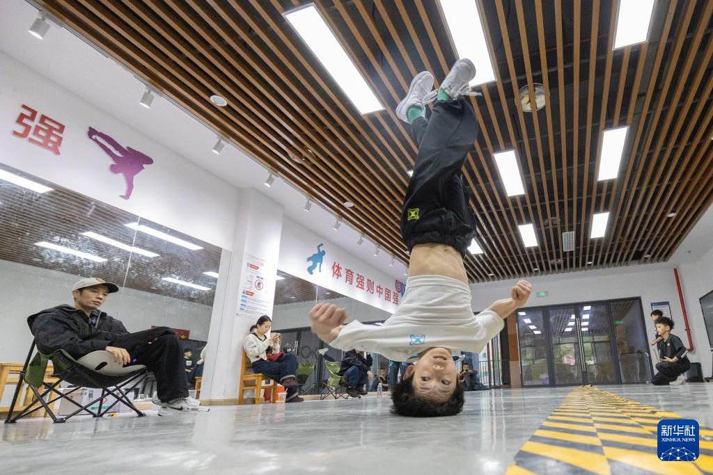 4月13日,在重庆市沙坪坝区霹雳舞队训练基地,李勇秋进行日常训练。