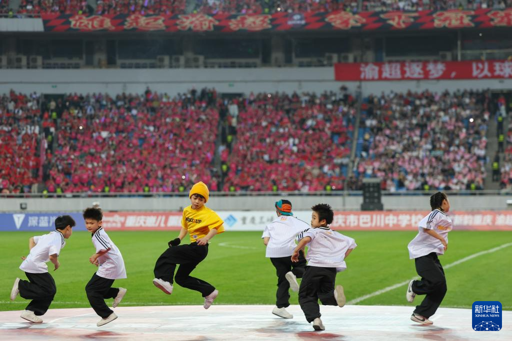 4月12日,在重庆市九龙坡区奥体中心体育场,李勇秋(中)和小伙伴一起在2025重庆城市足球超级联赛总决赛现场表演。