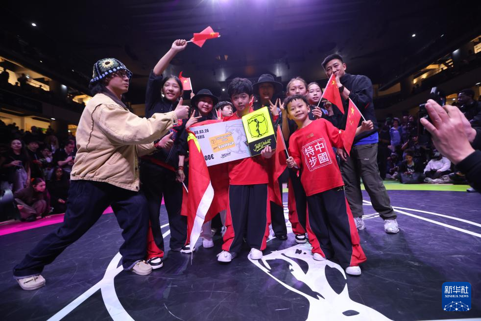 在法国巴黎,李勇秋(前左二)获得Juste Debout 2026少儿组全球总冠军后与团队成员合影(3月8日摄)。