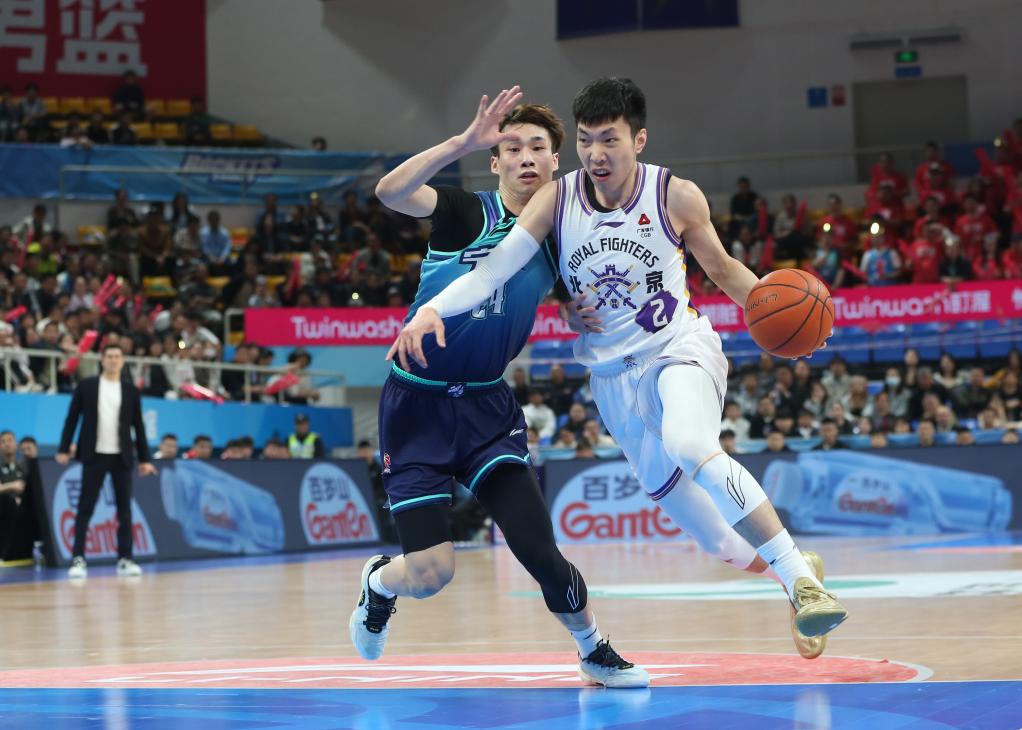 4月24日,北控队球员廖三宁(右)在比赛中带球进攻。新华社发(索向鲁摄)