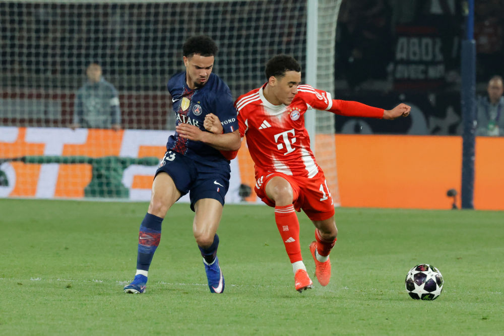 4月28日,巴黎圣日耳曼队球员扎伊尔-埃梅里(左)与拜仁慕尼黑队球员穆西亚拉在比赛中拼抢。新华社发(亨利·施瓦茨摄)