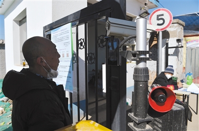 2020年3月4日,东南次村,一位村民在村中唯一的出入口“刷脸”进村。资料图片/新京报记者 李木易 摄