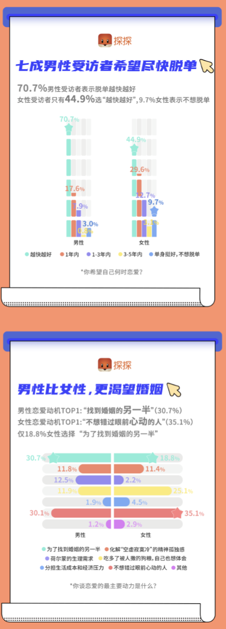 “探探平台上有很多交友、婚恋相关的讨论,我们也会主动设计一些话题。”探探相关负责人表示,不少年轻人会把自己对亲密关系的困惑发到探探上,跟网友交流。“这些讨论非常有价值,从中能够看到当代年轻人最新的观念演变趋势。这也有助于我们更好地理解年轻人,帮助年轻人交友。”
