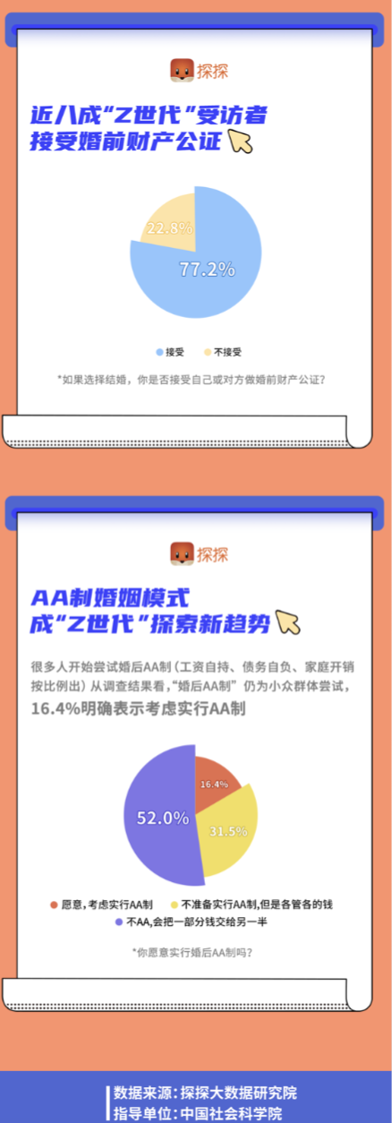 “Z世代”女性在经济、思想上都更加独立。近八成受访者接受婚前财产公证,40.1%女性受访者非常赞同女性应婚前买房,小部分人开始探索AA制婚姻。无论是从经济上还是相处模式上,“Z世代”青年都在全方位思考和探索更加平等的恋爱、婚姻关系。
