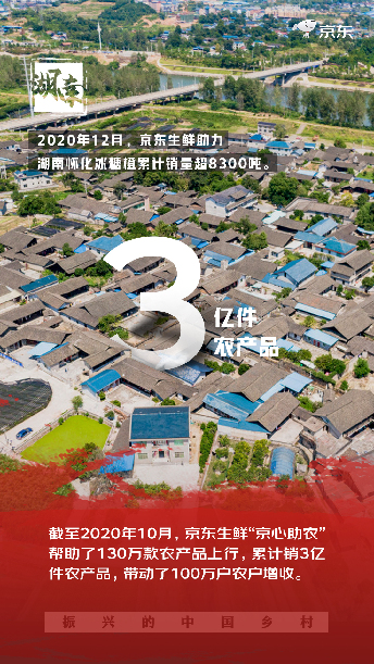 2020年12月,京东生鲜助力湖南怀化冰糖橙累计销量超8300吨,京东超市帮助四川理塘销售农产品达到110余种,线上销售额达6000余万元……