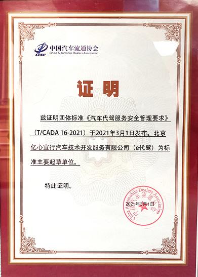 2020年5月,中国汽车流通协会发布团标项目计划,《汽车代驾服务安全管理要求》正式立项;同年6月,标准起草工作组正式成立。此后将近1年的时间内,在中国汽车流通协会、中国道路交通安全协会的联合指导下,e代驾作为主要起草单位,先后召开了7次标准研讨会,吸纳了全国70%以上代驾公司的意见及建议,同时将成立10年以来的安全理念、安全制度、安全经验进行整理。2021年3月1日,《汽车代驾服务安全管理要求》团体标准被批准予以发布,4月1日起正式实施。