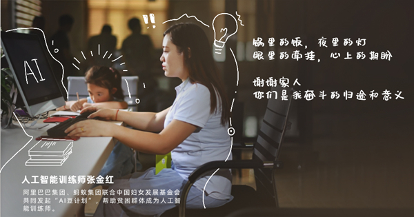 家乡就业机会有限,生活的重担一下子压到了在铜仁做装修的丈夫身上,全家一年2万多元的收入勉为其难。2019年,阿里巴巴集团、蚂蚁集团联合中国妇女发展基金会共同发起“AI豆计划”,在贫困地区孵化社会企业,免费培训“人工智能训练师”并建立职业认证标准,在家门口解决就业问题。