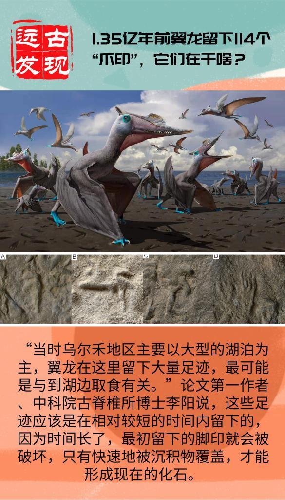 “当时乌尔禾地区主要以大型的湖泊为主,翼龙在这里留下大量足迹,最可能是与到湖边取食有关。”李阳说,这些足迹应该是在相对较短的时间内留下的,因为时间长了,最初留下的脚印就会被破坏,只有快速地被沉积物覆盖,才能形成现在的化石。