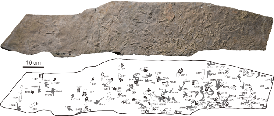 乌尔禾翼龙足迹(新种)化石照片及线条图。(中科院古脊椎所供图)