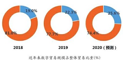据国家工业信息安全发展研究中心测算,2020年,我国数字贸易规模达到1.46万亿元,同比增长20.5%,增速高于服务贸易整体增速15.6个百分点,数字贸易占整体服务贸易的比重从2019年的22.3%增长至2020年的25.6%,数字贸易对服务贸易的贡献率持续攀升。