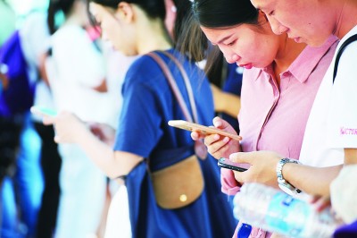 等公交车的年轻人在玩手机。黄杰显摄/光明图片