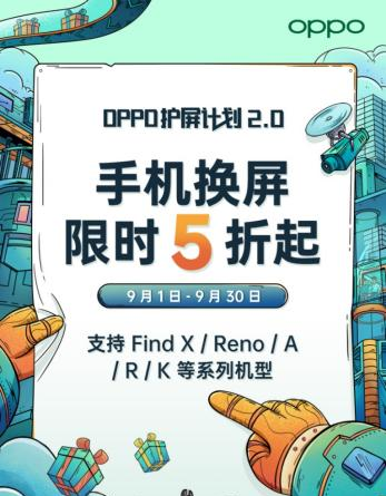 今年9月1日-9月30日,OPPO“护屏计划”活动升级为2.0版本再次回归,并针对手机屏幕损坏、电池老化等多项用户痛点展开一系列优惠福利,以原厂新屏换新最低5折起、严选电池盖6折起等福利活动回馈用户。