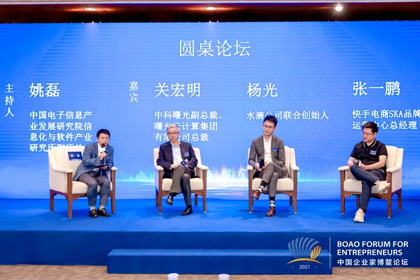 在博鳌数字经济发展论坛的圆桌讨论环节,中国电子信息产业发展研究院信息化与软件产业研究所副所长姚磊,中科曙光副总裁、曙光云计算集团有限公司总裁关宏明,中国恒瑞有限公司董事长顾勇涛,水滴公司联合创始人杨光以及快手电商SKA品牌运营中心总经理张一鹏等嘉宾,就数字基础设施在数字经济发展中的作用,企业在建设数字基础设施中如何贡献力量,以及数字经济推动商业模式创新等方面的议题展开了深入讨论与交流。