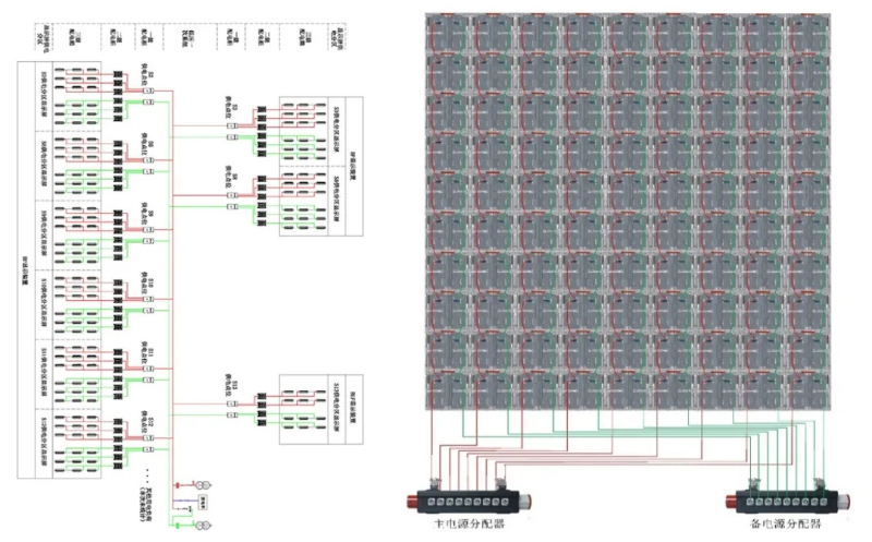 即在每个LED单元箱体内配置一主一备两个开关电源,两个电源的工作模式为均流热备模式。正常供电时,每个电源带载50%的用电负荷,当其中一块电源故障时,另一块电源可立即带载100%的用电负荷,无切换断电延时。