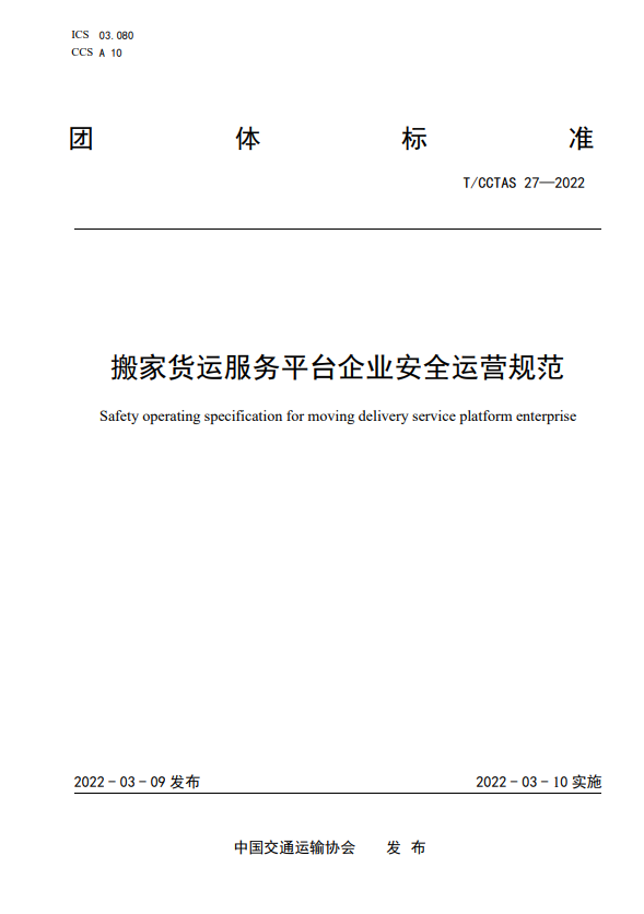 该团体标准由中国交通运输协会物流技术装备专业委员会、深圳依时货拉拉科技有限公司共同提出,北京交通大学以及7家企业共同参与制定。该标准是我国搬家行业首个安全运营标准,能够预防以及处置搬家货运服务平台运营服务过程的一些安全事件,借助技术手段和监测设备,加强事前、事中、事后安全风险和隐患管控,从而保障线上线下服务的安全和品质。