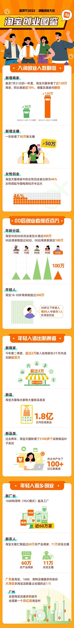 今年,线上线下共计28万商家报名参加了造物节活动,是历年多最多的一次。与之对应,“入淘”创业人数呈现持续增长态势。数据显示,截至7月31日,在过去一年里,淘宝天猫净增了近120万商家,增量与增速均翻了一倍多。