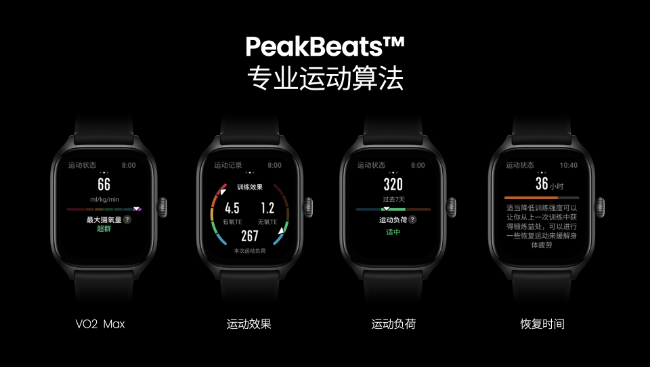 配合华米科技自研的 PeakBeats™ 运动算法,在单次运动后可以获悉最大摄氧量(VO2 Max)、恢复时间(RT)、运动负荷(TL)和训练效果(TE)的数据分析,让运动更加专业。