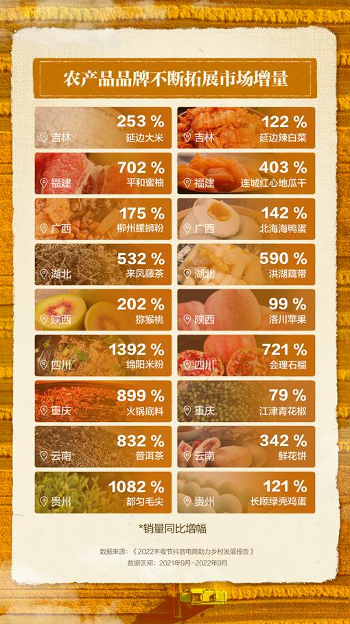 兴趣电商在推动乡村产品多元价值展现的同时,也加速了区域农产品品牌不断发展和焕新。吉林的延边大米、辣白菜,福建的平和蜜柚、连城红心地瓜干,广西的柳州螺蛳粉、北海海鸭蛋,陕西的猕猴桃、洛川苹果等地标农产品在销量增长的基础上,不断拓展品牌知名度。