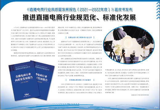 9月25日,《直播电商行业高质量发展报告(2021—2022年度)》蓝皮书(简称“蓝皮书”)正式发布。蓝皮书由国家市场监督管理总局直属的中国计量科学研究院主编、中国质量认证中心等单位参与编制、美腕(上海)网络科技有限公司(简称“美腕公司”)等企业提供重要研究样本支持。蓝皮书系统梳理了直播电商行业国家监管政策法规、平台监管规则与专项治理行动,分析了直播电商行业标准、检验检测、认证、质量管理水平发展情况,总结了直播电商行业在助力中国品牌发展、经济内循环和乡村振兴中发挥的重要作用,以及行业发展面临的挑战与应对措施。
