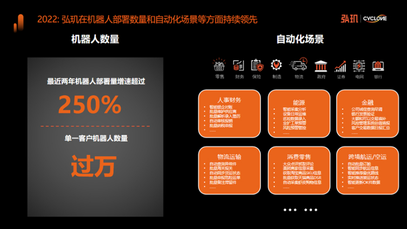 同时,弘玑Cyclone近两年机器人的部署量增速超过250%,并在2022年实现了单一客户机器人数量过万的里程碑;从自动化场景上看,弘玑已经实现横跨多个行业如金融,能源,制造,物流等领域,多达约3000个场景。