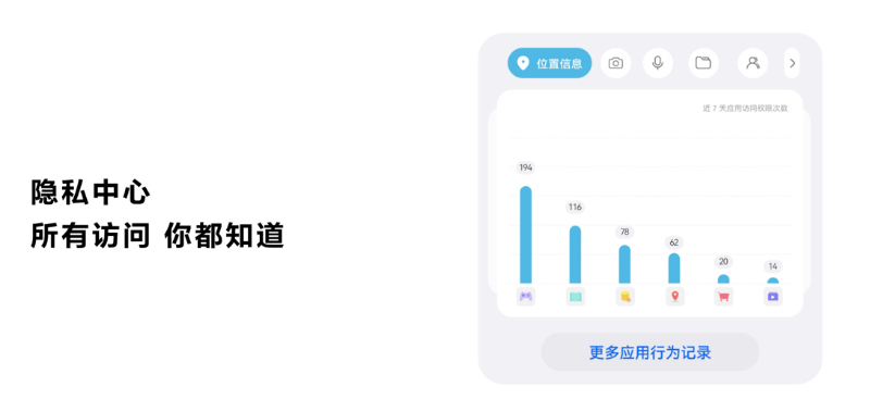 每个人都应该养成定期查看手机隐私设置的好习惯,如今很多手机也提供了相对应的功能。例如华为,此次华为升级的HarmonyOS3系统中升级的两大中心之一,隐私中心是用户查看所有应用行为的总看板,会实时统计和记录手机所有应用,并以图表的形式展现,应用访问位置、相机、麦克风等敏感权限次数都可以直观呈现,能够让用户快速关注到重点隐私权限行为。比如,一些天气类APP或者自拍类APP,进行软件操作的同时需要获取用户的位置和权限。当触及这些敏感操作的时候,隐私中心能够主动根据手机状况推荐隐私保护建议。
