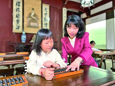 一进教学楼,耳畔便传来“大珠小珠落玉盘”的悦耳声——这是珠算传习班在上课。