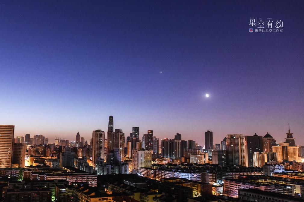 天津市天文摄影爱好者杨婧2022年2月27日黎明时分在天津市南开区拍摄的金星伴月。(本人供图)