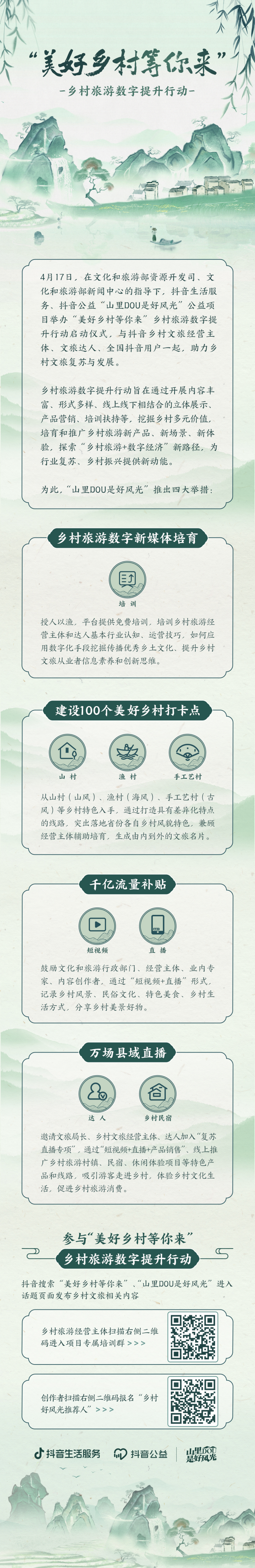 4月17日,“美好乡村等你来”乡村旅游数字提升行动启动仪式暨“山里DOU是好风光”助力乡村文旅复苏发布会在北京召开,主题为“花明柳绿又一村”。活动由文化和旅游部资源开发司、文化和旅游部新闻中心指导 ,抖音生活服务、抖音公益主办,发布了开展数字新媒体培育、建设100个美好乡村打卡点、千亿流量补贴、万场县域直播等四大乡村旅游数字化提升措施。