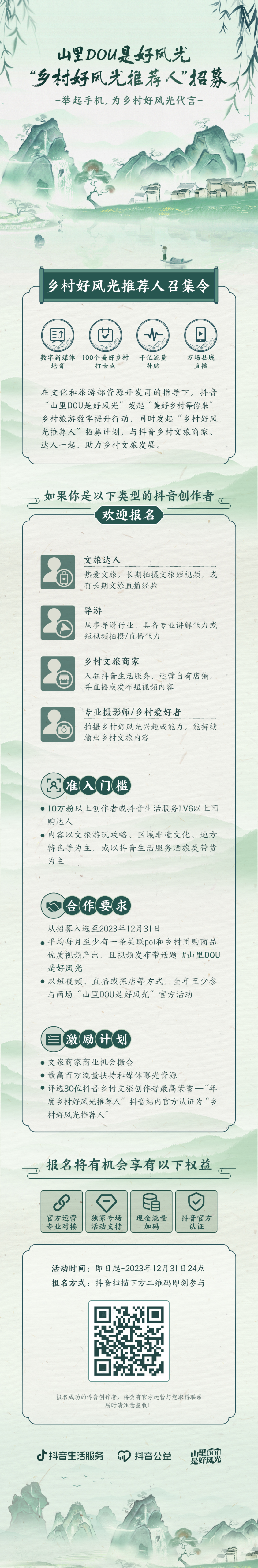 同时,发布会发起“乡村好风光推荐人”招募计划,号召文旅达人、专业导游、乡村文旅商家、普通文旅爱好者加入推广乡村好风光队列。举起手机,记录乡村风景、人文。2023年,“山里DOU是好风光”将落地浙江、福建等省份。“乡村好风光推荐人”将有机会参与到各省份的活动中,并获得对应激励。
