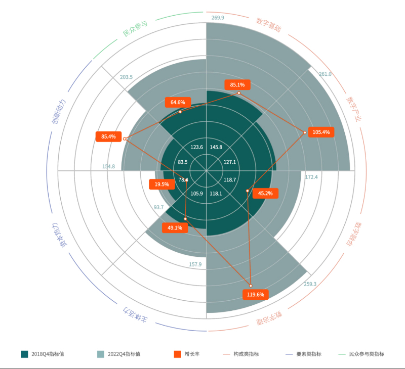 看驱动,创新动力、数字产业、数字治理“三轮驱动”。2018-2022年间,创新动力、数字产业、数字治理三项指标增长最快。创新动力与数字产业相互依存、相互影响、相互促进,共同构成了当下中国数字经济发展的先导性动力;数字治理能力的提升,为数字经济可持续规范发展提供了基础性保障。从创新动力来看,2022年中国数字经济核心产业发明专利授权量达到32.5万件,占全社会发明专利授权量的四成以上,数字技术储备和创新能力大幅提升。从数字产业来看,数字产业指标值四年翻番,2022年电子信息制造业顶住压力、有序恢复,软件业收入首次跃上10万亿元台阶。从数字治理来看,中国数字治理体系初步建立,“一网通办”“一网统管”“一网协同”创新实践不断涌现。