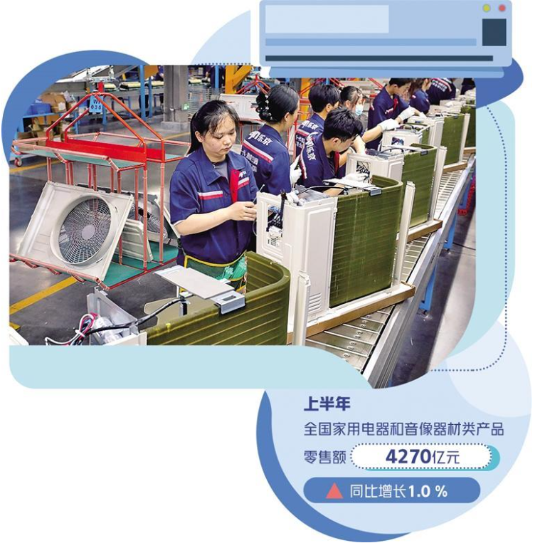 今年上半年,全国家用电器和音像器材类产品零售额4270亿元,同比增长1.0%,主要电商平台家电“以旧换新”和绿色智能家电下乡销售额同比分别增长67%和12.7%。