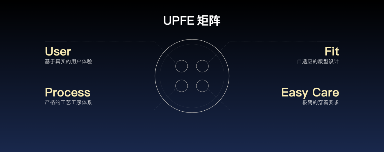 “衬衫老罗”对于高端衬衫是这样定义的,它必须符合UPFE四大标准,即User、Process、Fit、Easycare。User指用户,衬衫的必要属性是满足日常穿着需求,舒适是最基本的标准,用户的体验是衡量的唯一标准;Process指工艺及工序体系,产品诞生经过严格的打磨,细节的优化和微调,把专业做到极致;Fit指自适应,扭转传统购买衬衫的观念,不应该是人去适应产品,而是应该是产品去适应人体的版型需求,每一件衬衫都拥有定制版的体验,才是高端的起点;Easycare指极简打理要求,传统高端衬衫保养流程繁琐复杂,新一代高端衬衫应该方便打理,感受高端产品的同时简化打理时间。
