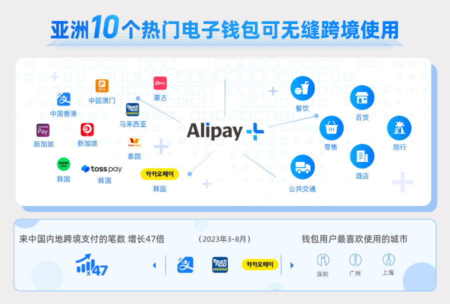 2023年3月至8月期间,通过Alipay+接入的首批境外钱包Kakao Pay、Touch 'n Go eWallet和AlipayHK的在境内支付总笔数在6个月内增长了47倍。