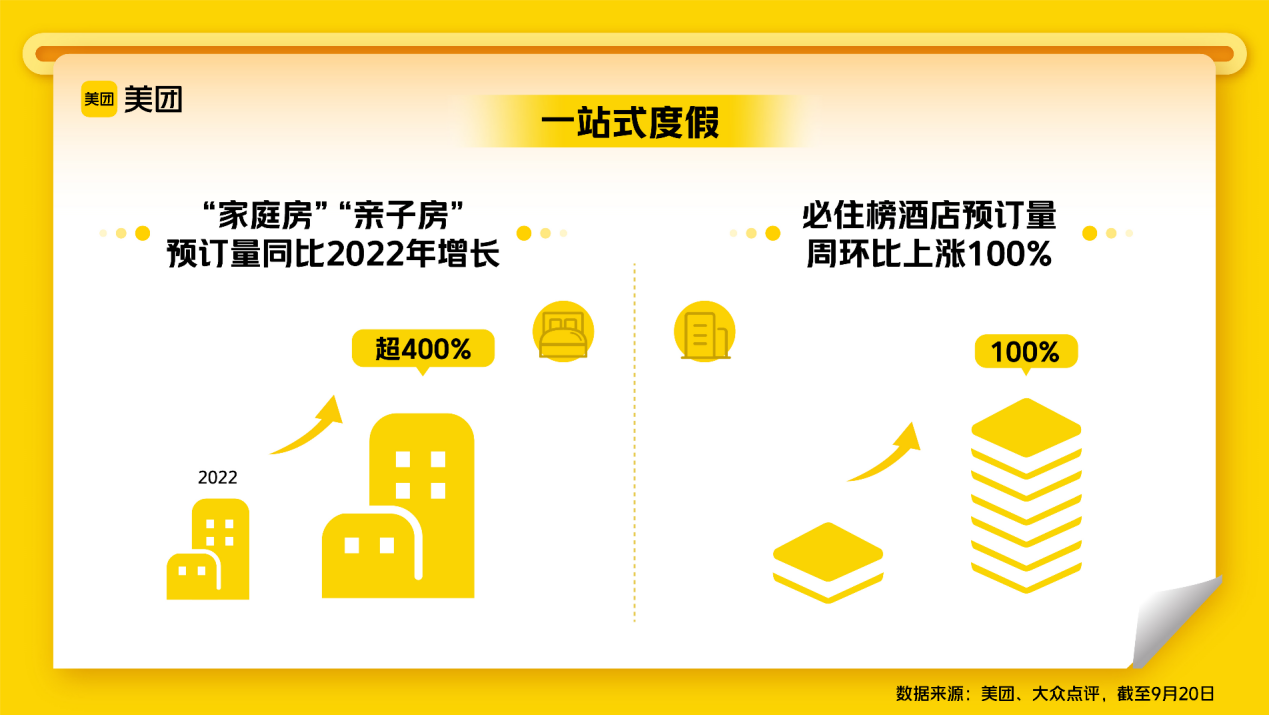 超长黄金周期间,出游热潮有望重现,“住着玩”、长线游等迎来节前预订小高峰。越来越多的消费者也开始在美团、大众点评等平台上一站式预定“吃住行游娱”全套行程。