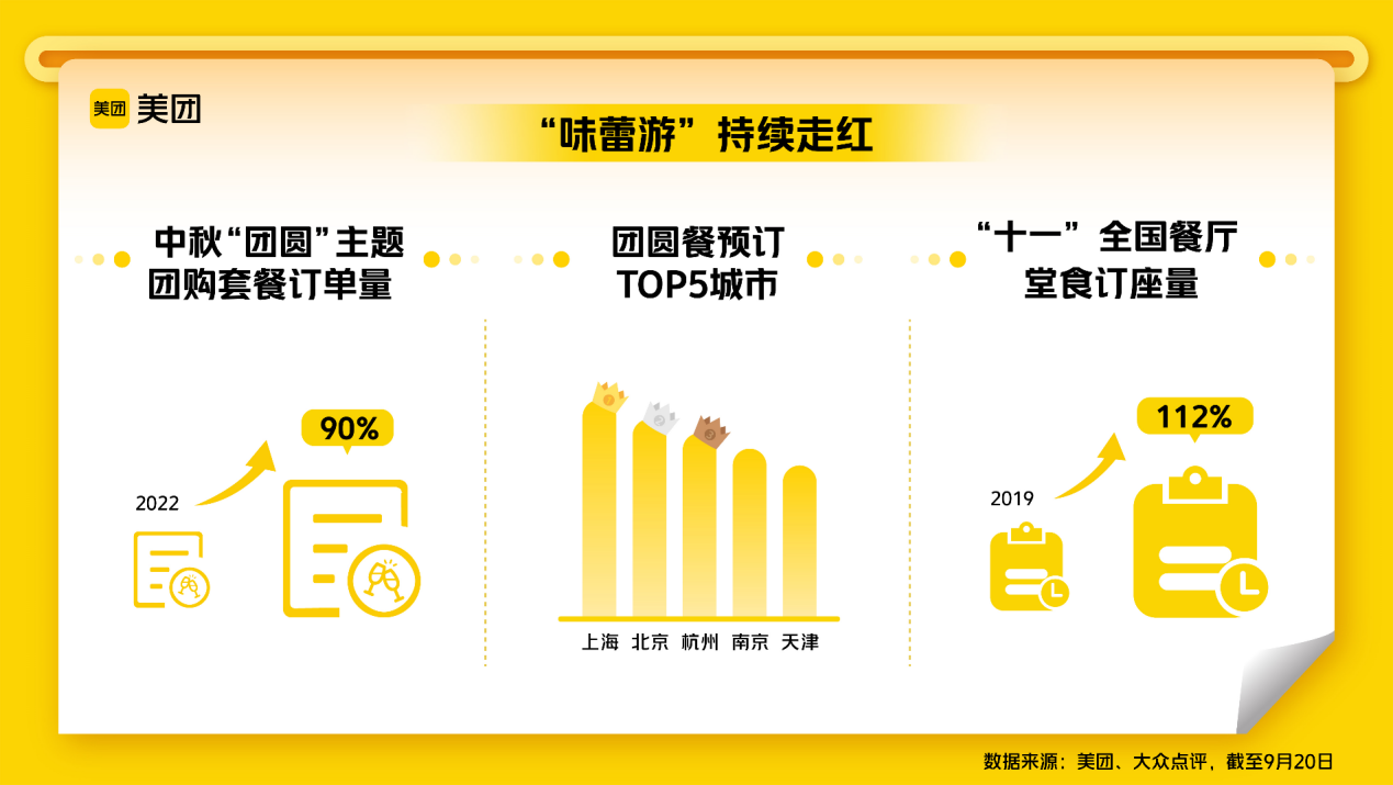 到宁波吃海鲜、到宁夏吃滩羊肉、到苏州吃大闸蟹.......中秋前后,各地的必吃美食火热“上新”,假期“味蕾游”持续走红,餐饮行业将迎来最火“国庆档”。美团、大众点评数据显示,截至9月20日,“十一”黄金周期间,全国餐厅堂食线上订座量较2019年同期增长112%,较去年同期相比,中秋“团圆”主题团购套餐订单量增长超90%,上海、北京、杭州、南京、天津五城的“团圆餐”预订最旺。