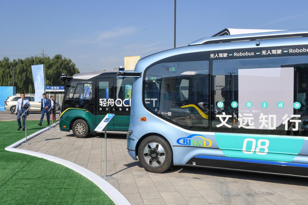9月21日,在2023世界智能网联汽车大会室外展区,参观者参观展出的无人驾驶小巴车。新华社记者 鞠焕宗 摄