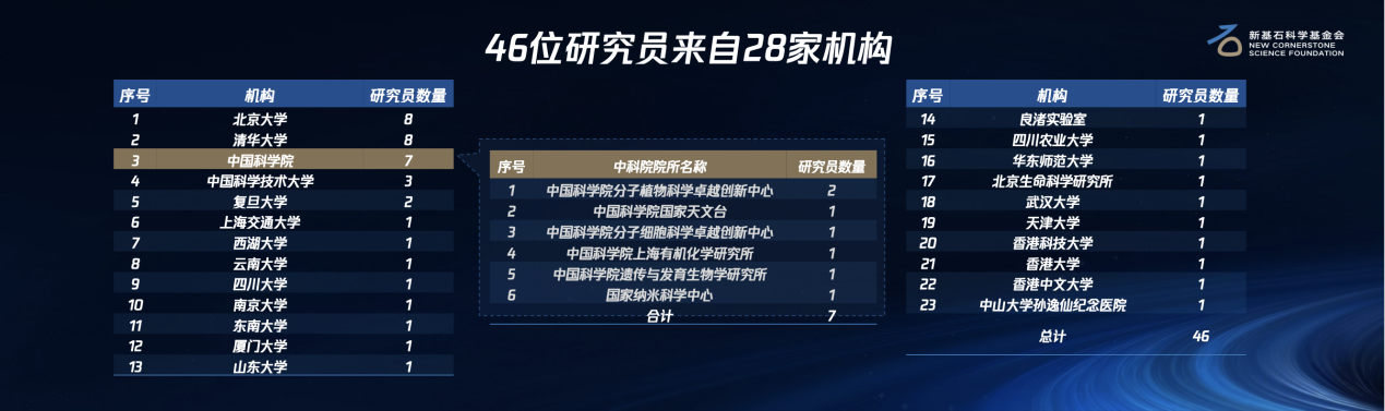 坚持“宁缺毋滥”的原则,第二期“新基石研究员”计划资助不超过50人,实际入选46名,其中数学与物质科学领域21位,生物与医学科学25位。46位研究员平均年龄47岁,远低于55岁的申报门槛,其中包括10位“80后”,最年轻的年仅38岁。他们来自13个城市的28家机构,从地域分布来看,天津、济南、武汉、广州等城市首次上榜;从机构来看,研究员的分布也更为广泛,良渚实验室等新型研究机构、四川农业大学、云南大学、香港科技大学等高校第一次有了“新基石研究员”。新一期研究员,印证着中国基础研究快速发展中蕴含的生机与活力。
