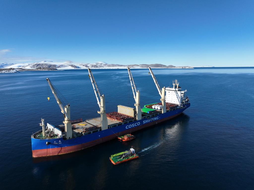 2023年12月8日,“天惠”轮在卸载建站物资(无人机照片)。执行中国第40次南极考察任务的“雪龙2”号和“天惠”轮,正在罗斯海新考察站开展卸货作业和人员登陆工作。新华社发(王海楠摄)