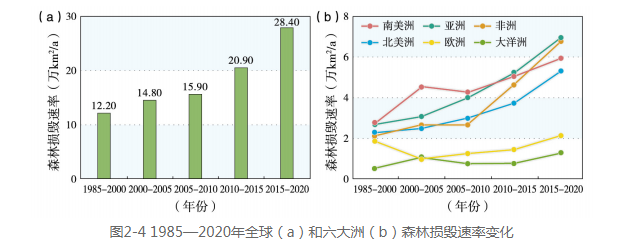 森林恢复是陆地生态系统碳吸收增加的主要来源之一。报告显示,1985—2020年,全球森林损毁与森林恢复在不同区域同时发生或同一区域交替出现,但恢复速率仍低于损毁速率。屋顶、停车场及道路等渗透率较小的表面,是城市化最显著的特征。监测期内,这种不透水面增幅达104.43%。全球森林损毁和不透水面扩张带来的结果是碳损失(陆地生态系统固定的碳重新释放到大气中)呈加速增长态势。