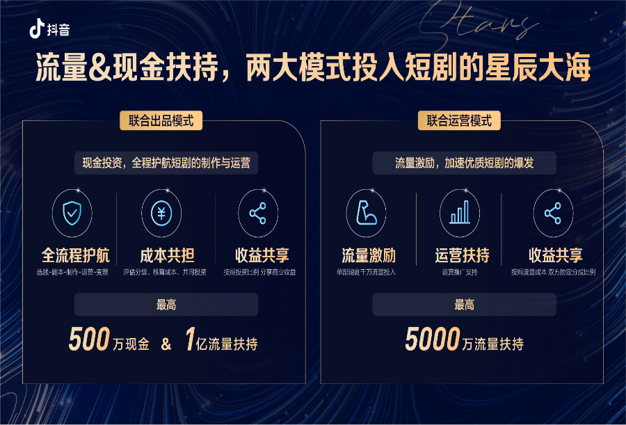 本次“辰星计划”发布会,则面向影视公司、MCN机构、个人创作者等更广泛的行业伙伴,发布联合出品、联合运营两大合作模式,推出最高500万现金和1亿流量扶持的方案。第一种联合出品模式,指抖音以现金投资的方式与制作方联合出品,并提供“选题立意、剧本创作、内容制作、账号运营”的全流程支持;第二种联合运营模式,由创作者和机构负责微短剧开发制作,抖音提供千万级流量扶持和全方位的运营支持。
