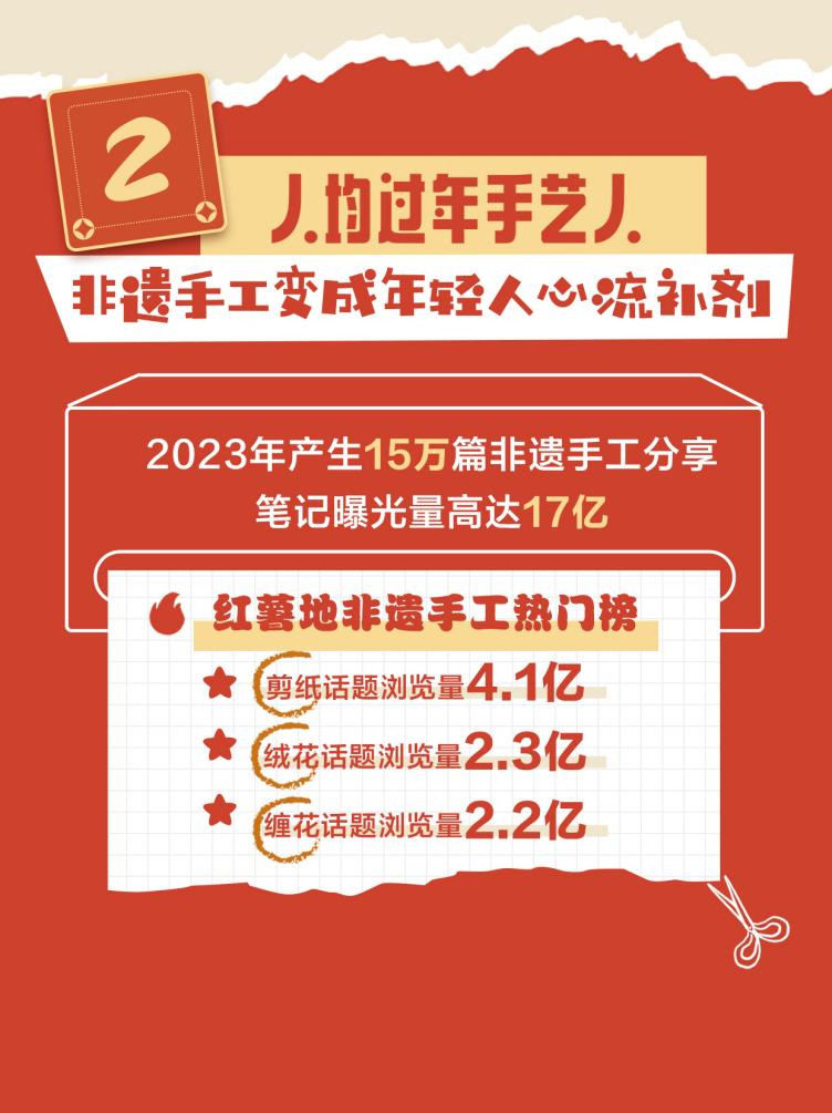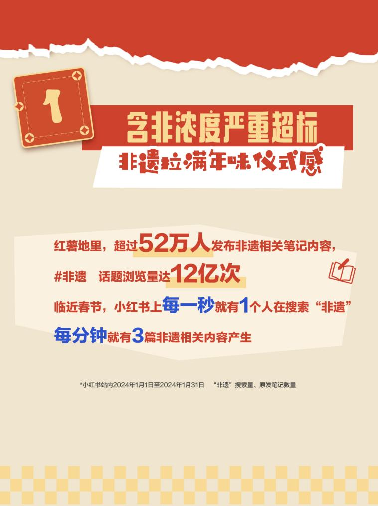 作为趋势潮流的策源地,年轻一代的潮流过年方式在小红书上凸显:非遗成为春节的“仪式感坐标”。据小红书2024年1月数据显示,在小红书每一秒就有1个人搜索“非遗”,每一分钟就有3篇非遗相关内容产生。