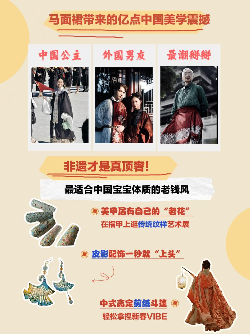 2023年小红书上与“马面裙”相关的笔记被发布在90多个海外国家与地区,中国年轻人穿着马面裙参加国外的毕业典礼、公司年会、演唱会,享受“给外国人带来一些小小的中国震撼”。今年春节超1万人参与小红书#全球同袍点亮世界地图#活动,年轻人在海外旅行目的地穿汉服、晒街拍,传递中国华裳之美。