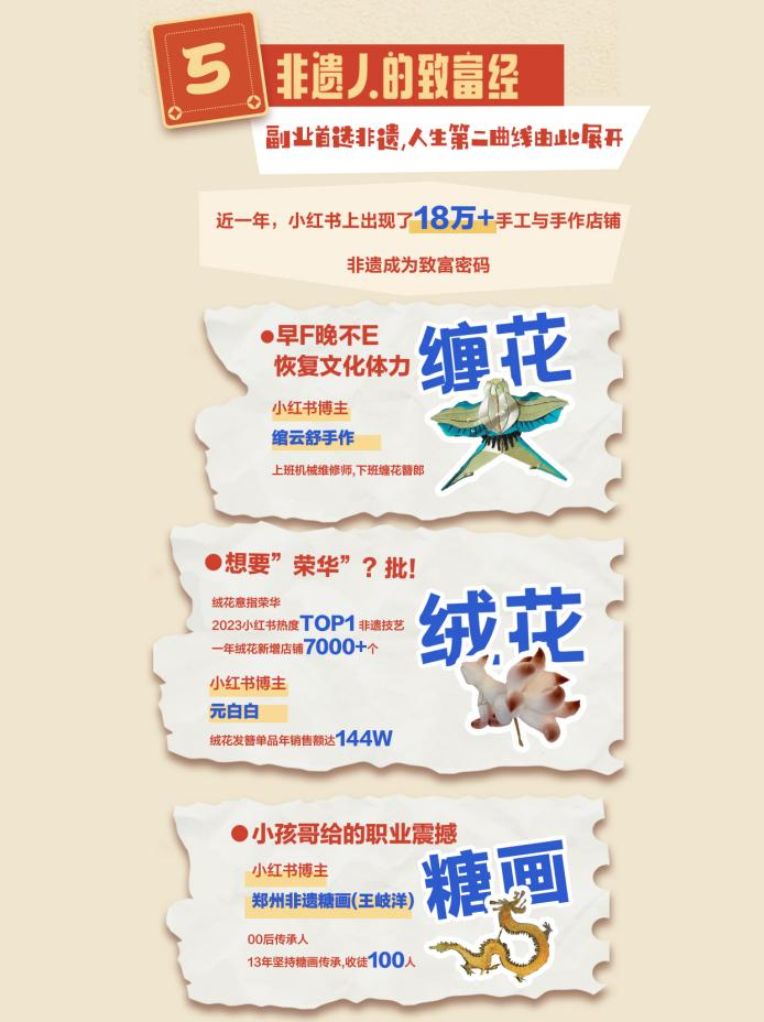 2023年小红书上新增18万家手工相关店铺,其中仅非遗绒花店铺就新增7000多家,小红书博主@元白白 绒花发簪单品年销售额超百万。在通过学习老手艺掘金的群体中,00后逐渐崭露头角,早早找到了财富密码。21岁的非遗糖画传承人王岐洋已经有了100多位徒弟;大学生阿闯在宿舍做面塑,通过小红书卖出了价值6600元的“龙行大运”手工作品,赚到了人生第一桶金。