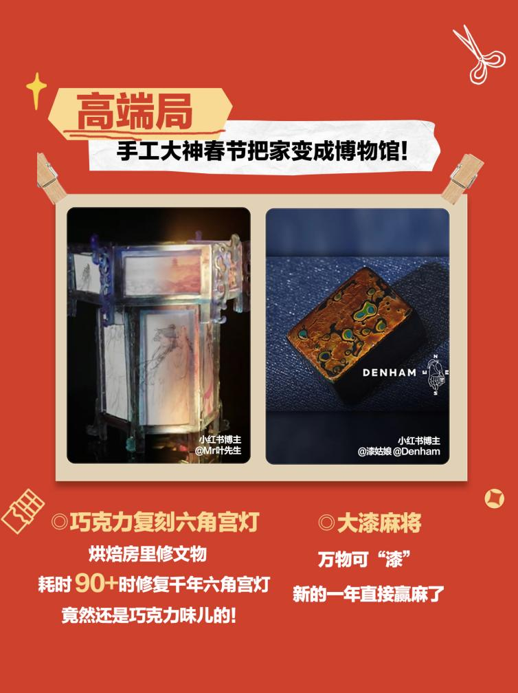 将所有的注意力投入在双手,让人忘记时间,手工所产生的心流体验带给年轻人极大的舒适感。借着手作盛行的东风,“万物可非遗”,年轻人复兴老手艺成为一种潮流,用巧克力复刻非遗文物卢宅珠灯、用大漆技艺做一副麻将,年轻人不拘泥于传统,跨材料、跨场景、敢创新,小红书上这样的创作越来越多,非遗手工大神有了自己的粉丝群。