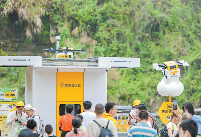 广东深圳市景区,美团无人机给游客配送各类外卖商品,刷新人们的文商旅融合与智能消费体验。