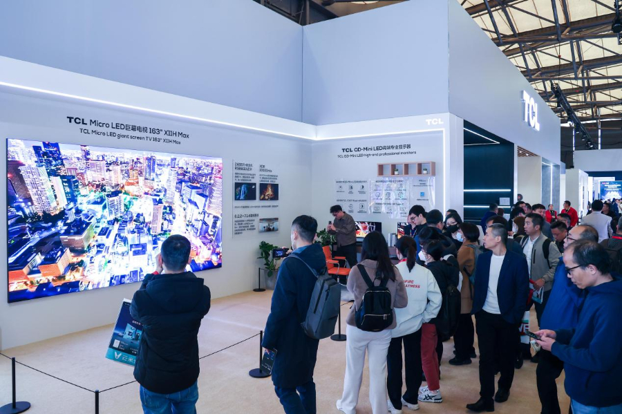 此外,TCL展区两款超大屏电视产品也同样引人注目。其中,163吋Micro LED巨幕电视X11H Max采用跨时代Micro LED显示技术,以及超2488万颗无机自发光芯片实现像素级精准控光,并搭载6.2.2+7.1.4超多声道音响系统,带来影院级影音体验。同时,TCL实业还带来了115吋QD-MiniLED电视,突破Mini LED电视量产尺寸的限制,采用领先的11代显示面板产线制造工艺,将家庭屏幕的观影体验推至行业峰值。