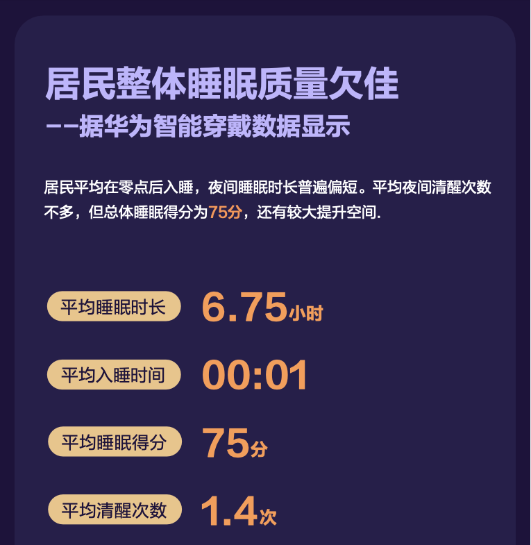 《白皮书》指出,居民整体睡眠质量欠佳,平均睡眠时长不足7小时,总体睡眠得分为75分,睡眠质量欠佳。